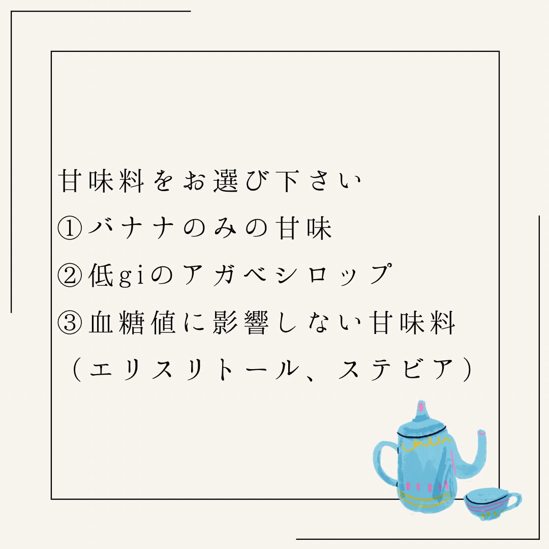 バナナのみの甘味、血糖値を上げない天然甘味料(エリスリトール/ステビア)、低giのアガベシロップ、てんさいオリゴ糖からご選択ください。選択がない場合は店主おすすめのアガベシロップでの発送になります。